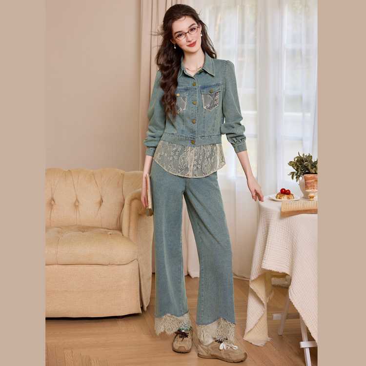 白鹿语 【蕾丝拼接丹宁牛仔套装】秋款时尚休闲翻领长袖长裤女式两件套