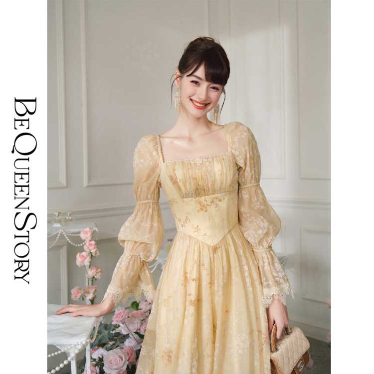 余潇潇 【金盏流年】轻奢优雅时尚肌理感泡泡花边袖修身长款礼服连衣裙
