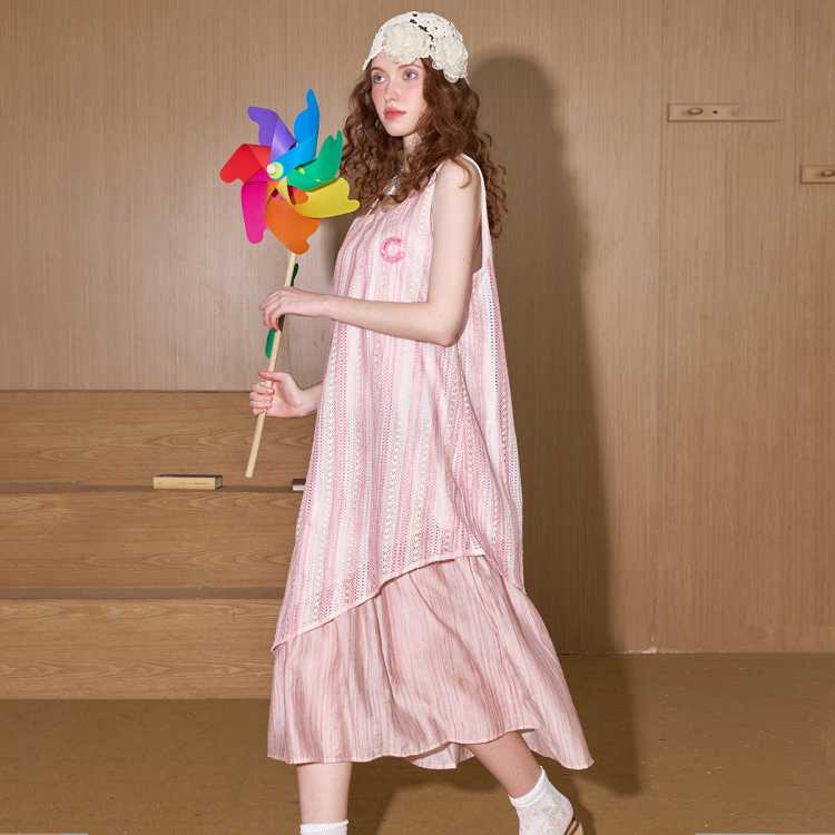 COOLHUT 镂空竖条纹宽松背心叠拼夏日度假风2025夏季连衣裙高级感