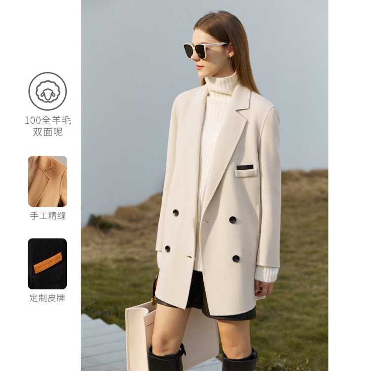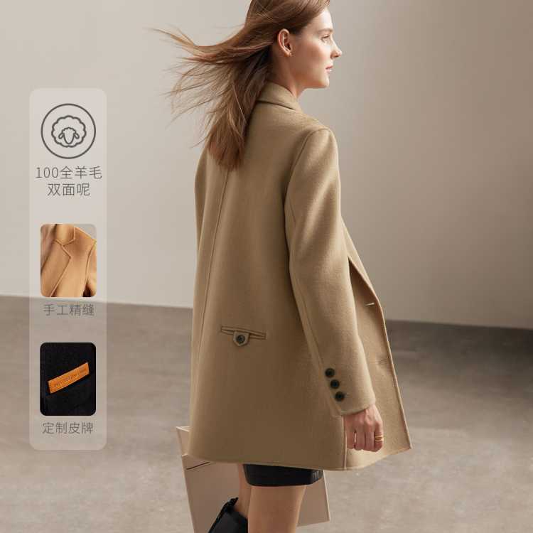AMII 冬款轻奢廓形感定制皮牌双排扣翻领绵羊毛双面呢外套女毛呢大衣